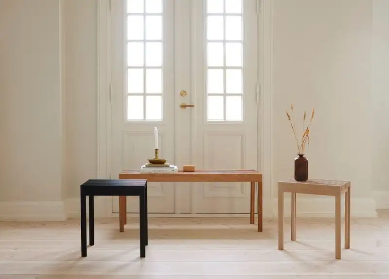 “With Lightweight, we wanted to pay tribute to classic carpentry traditions by constructing the furniture with beautiful and old-style wooden joints. We wanted to make a light impact furniture in both a visual and physical sense which reflects the quality grounded in our contemporary design language. The design is graphically tight but at the same time soft and tactile when used,” Herman Studio’s Helle Herman Mortensen and Jonas Herman Pedersen have said.