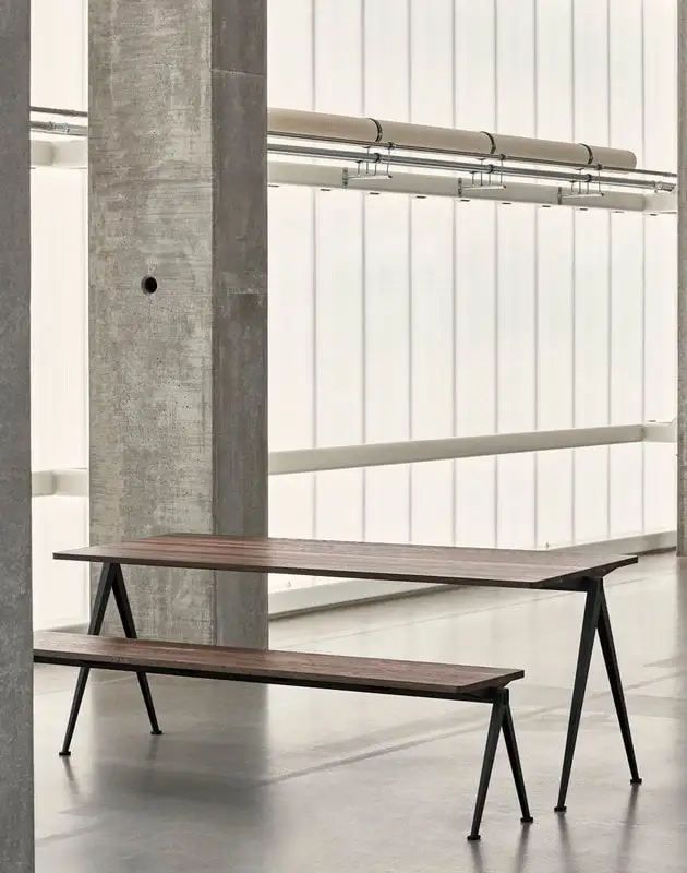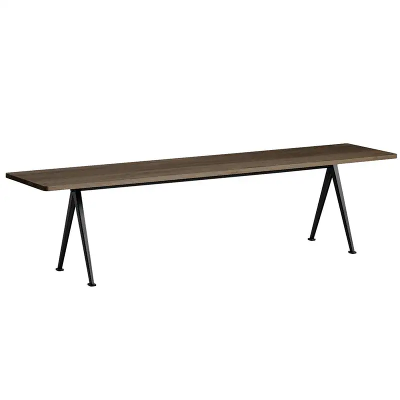 The Pyramid bench 12, by HAY in collaboration with Ahrend, is inspired by the design of the Pyramid table by Wim Rietveld. A simplistic combination of an angular steel frame and rectangular oak top, the Pyramid bench was regarded in the 1950s as a masterpiece in the innovative use of sheet steel, and it has maintained its fresh appearance until today. The Pyramid bench can be combined with the Pyramid table or used as a side bench or small side table anywhere in the house. Pyramid benches are available in different sizes and combinations of base colours and wood finishes.