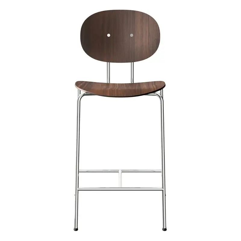 The seat material of the Piet Hein counter stool is bent wood veneer, and the dynamically positioned, slightly sloping legs are made of steel. Thanks to the stackable frame and the slender yet sturdy design, the Piet Hein stools are well suited for both home and restaurant use.
