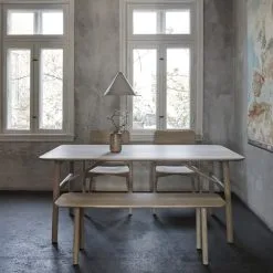 Skagerakâs Georg bench is part of a charming collection of wooden furniture designed by Chris Liljenberg Halstrøm. The clean-lined bench is made of FSC certified oak and the cushion upholstered with wool is attached with simple leather strings.