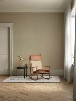 The rocking chair is finished with a headrest and a seat cushion upholstered in Camo Leathers’ Silk aniline leather. Aniline is the softest and most natural type of leather, and it will develop a characterful patina over time – this will also depend on exposure to light and conditions of use. Please note that due to the natural materials, aniline leather and rattan, the rocking chair should not be placed in direct sunlight or right next to a heat source such as a fireplace.